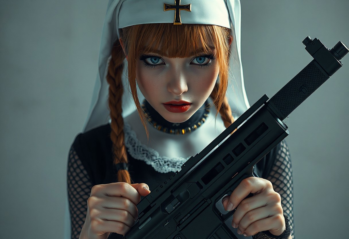 (ultra realistic 8k cg, raw photo:1.0), (photorealistic:0.5), (best (full-body portrait +.1.6)))) quality:1.3), (masterpiece:1.3), ((((ultra-realistic details, extremely details, sharp focus, high res, (((far shot, wide shot, vanishing point))), 1girl, (disgust:1.2, shaded face, glare, sadist, shadow fullbody portraitover eyes, glaring, looking down at the viewer:1.3), (conservative), ((wear sexy nu mini skirt)), (black dog collar with spikes), (black fishnet strap stockings, black shirt, (white decoration white lingerie sexy lace, red lips, (black luxury high heels makeup, picture-perfect detail face, highly detailed eyes, (blue eyes), ((looking at the viewer)), ginger hair, long twin braids, nun headwear with the cross of Jesus emblem, sexy n7n 8s armed with a katana sword and uzi submachine gun, both with ca5holics insignia emblems in golden color