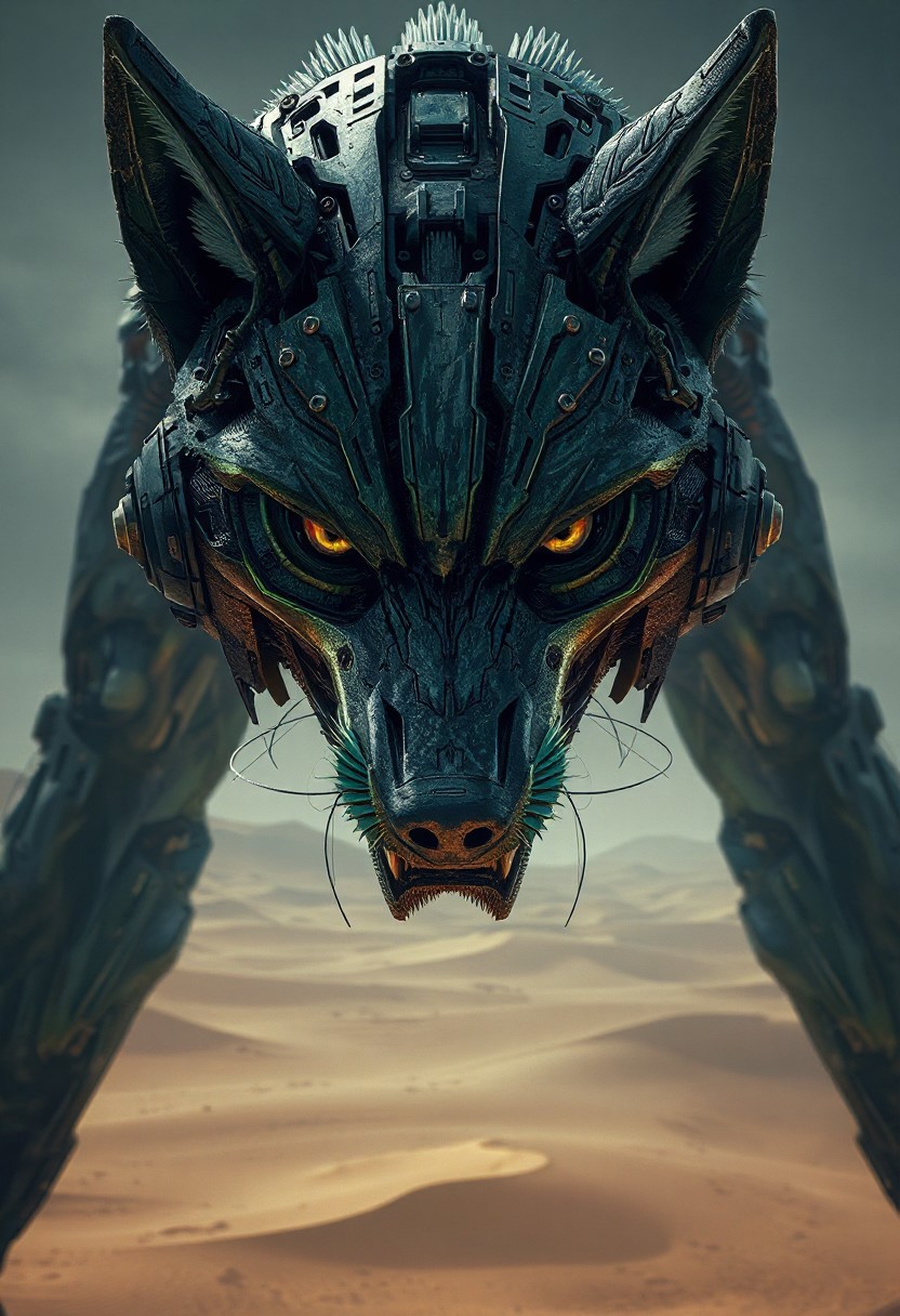 ultra-high quality, ultra-detailed image of a hybrid mechanical wolfman, hybrid creature, mid male human, mid Wolf, seamlessly blending mechanical and organic elements, dark and green colors, commanding presence, capturing her entire body, Face: Highly detailed, lifelike features with expressive, piercing eyes that convey her strength, fierce, showing a natural blend of mechanical and organic textures, vast, desolate desert of dunes, evoking an abandoned planet, barren landscape.