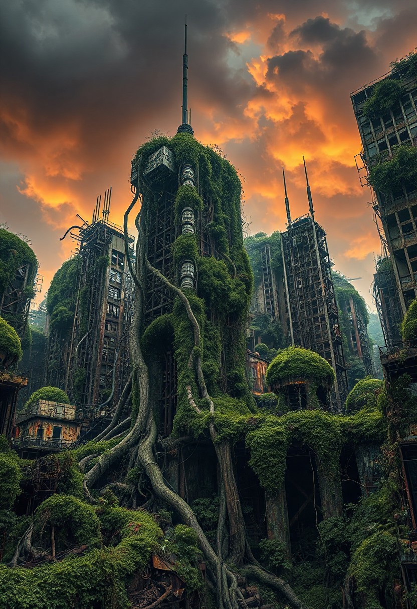 Masterpiece, 32K resolution, ultra-detailed, cinematic realism, HDR lighting, a forgotten mechanical city overtaken by massive roots and twisted vines, organic forms reclaiming rusted skyscrapers, nature fusing with machine, moss-draped steel, surreal textures, overgrown elegance, dark orange sky with heavy and dense clouds