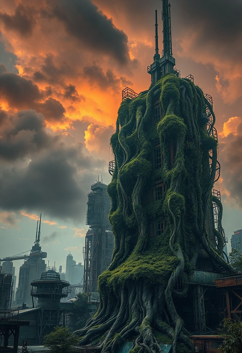 Masterpiece, 32K resolution, ultra-detailed, cinematic realism, HDR lighting, a forgotten mechanical city overtaken by massive roots and twisted vines, organic forms reclaiming rusted skyscrapers, nature fusing with machine, moss-draped steel, surreal textures, overgrown elegance, dark orange sky with heavy and dense clouds