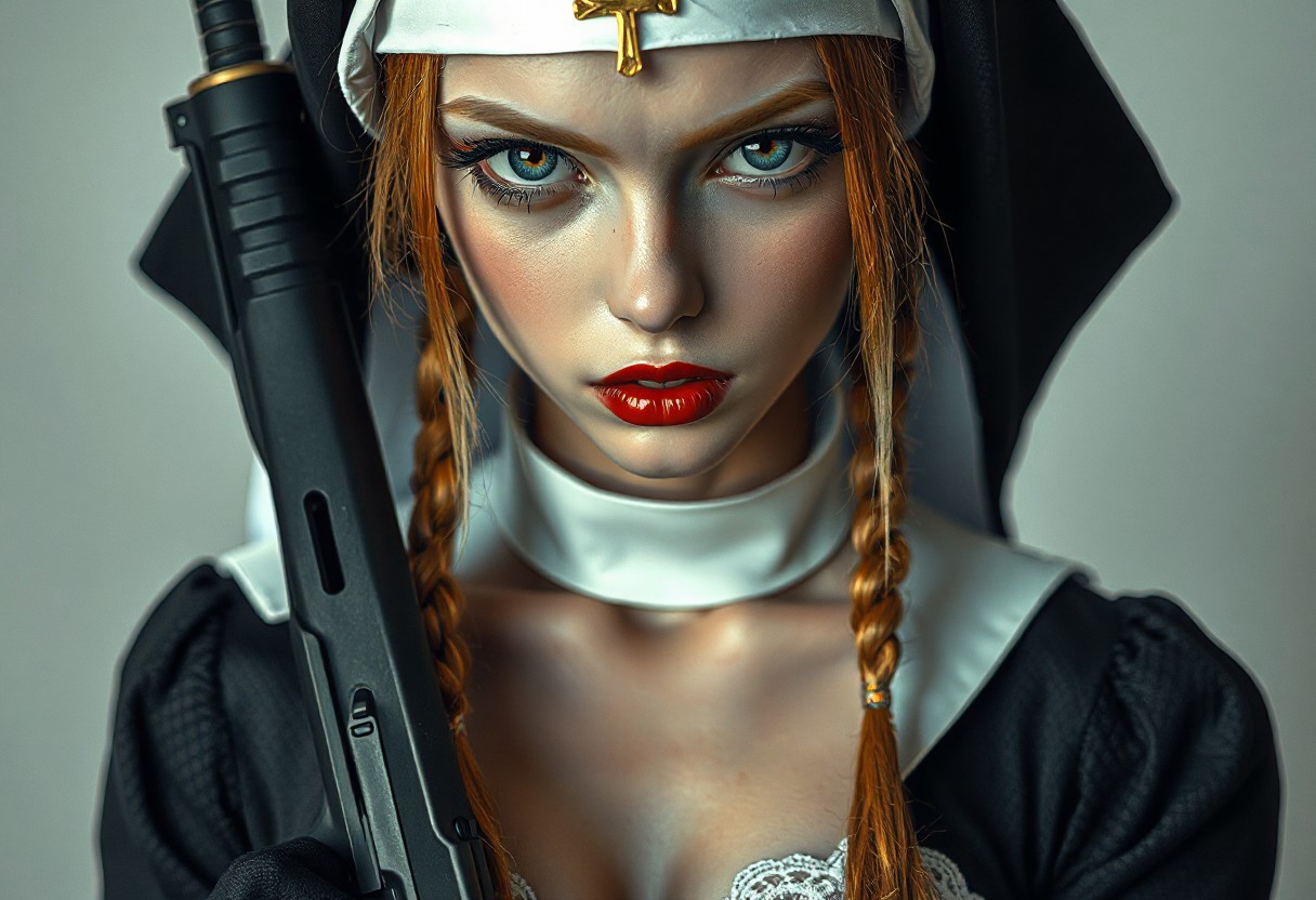 (ultra realistic 8k cg, raw photo:1.0), (photorealistic:0.5), (best (full-body portrait +.1.6)))) quality:1.3), (masterpiece:1.3), ((((ultra-realistic details, extremely details, sharp focus, high res, (((far shot, wide shot, vanishing point))), 1girl, (disgust:1.2, shaded face, glare, sadist, shadow fullbody portraitover eyes, glaring, looking down at the viewer:1.3), (conservative), ((wear sexy nu mini skirt)), (black dog collar with spikes), (black fishnet strap stockings, black shirt, (white decoration white lingerie sexy lace, red lips, (black luxury high heels makeup, picture-perfect detail face, highly detailed eyes, (blue eyes), ((looking at the viewer)), ginger hair, long twin braids, nun headwear with the cross of Jesus emblem, sexy n7n 8s armed with a katana sword and uzi submachine gun, both with ca5holics insignia emblems in golden color