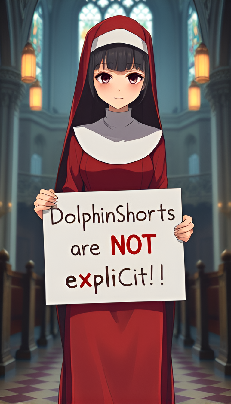 standing, in Red Traditional Nun Outfit, nun coif and long habit, Very Sad Anime slender 20yo female in church, holding big sign reading "DolphinShORTS are NOT eXpliCit !", teary eyes, looking down saddened