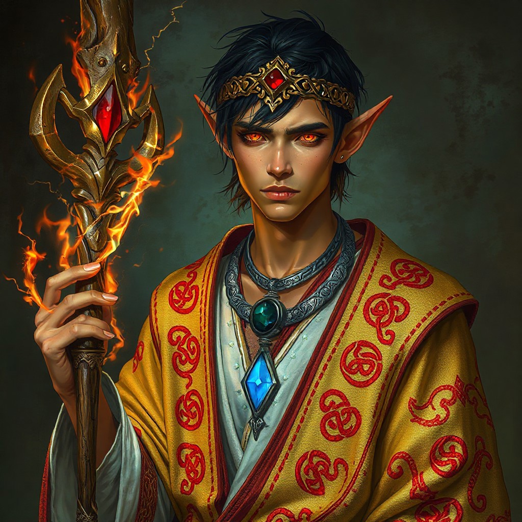 A handsome elf of twenty years, with reddish-orange skin and black hair, his hands ending in claws. His eyes are a vivid, glowing red, almost as if a dim fire were caught behind them. He wears a rich white under-robe with arcane runes etched into it in dark green thread, covered by an outer robe woven of golden cloth, covered with flowing Celtic knots embroidered in bright crimson thread on it. In one hand he holds a polished wooden staff crackling with electricity. In the other hand he holds a flame. On his head is a golden circlet formed in intricate patterns, with a red gem in front. Around his neck is a silver necklace tight enough to be a collar, with a glowing blue gem in front.