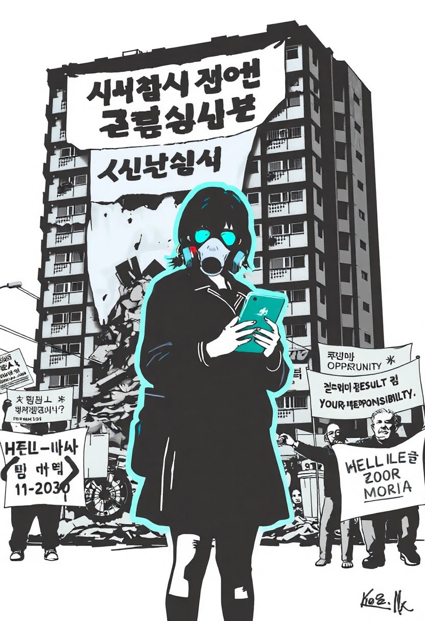 JNANX,luminous white silhouette,cyan glow,emerald highlights,flickering outline,dreamlike movement, A Banksy-style stencil graffiti artwork. A Korean high school student wearing a school uniform and a gas mask stands in front of a collapsing apartment building with a huge banner reading: "Cheong-yak dae-gi 10-nyeon"). She holds a smartphone showing a cryptocurrency chart, ignoring a homeless elderly man reaching toward her. Behind them, protest banners say: "Hell Joseon 2030" and "Equal opportunity, but the result is your responsibility". The entire image is grayscale, except for the glowing phone screen in red and green. Bold, satirical, politically and socially critical.