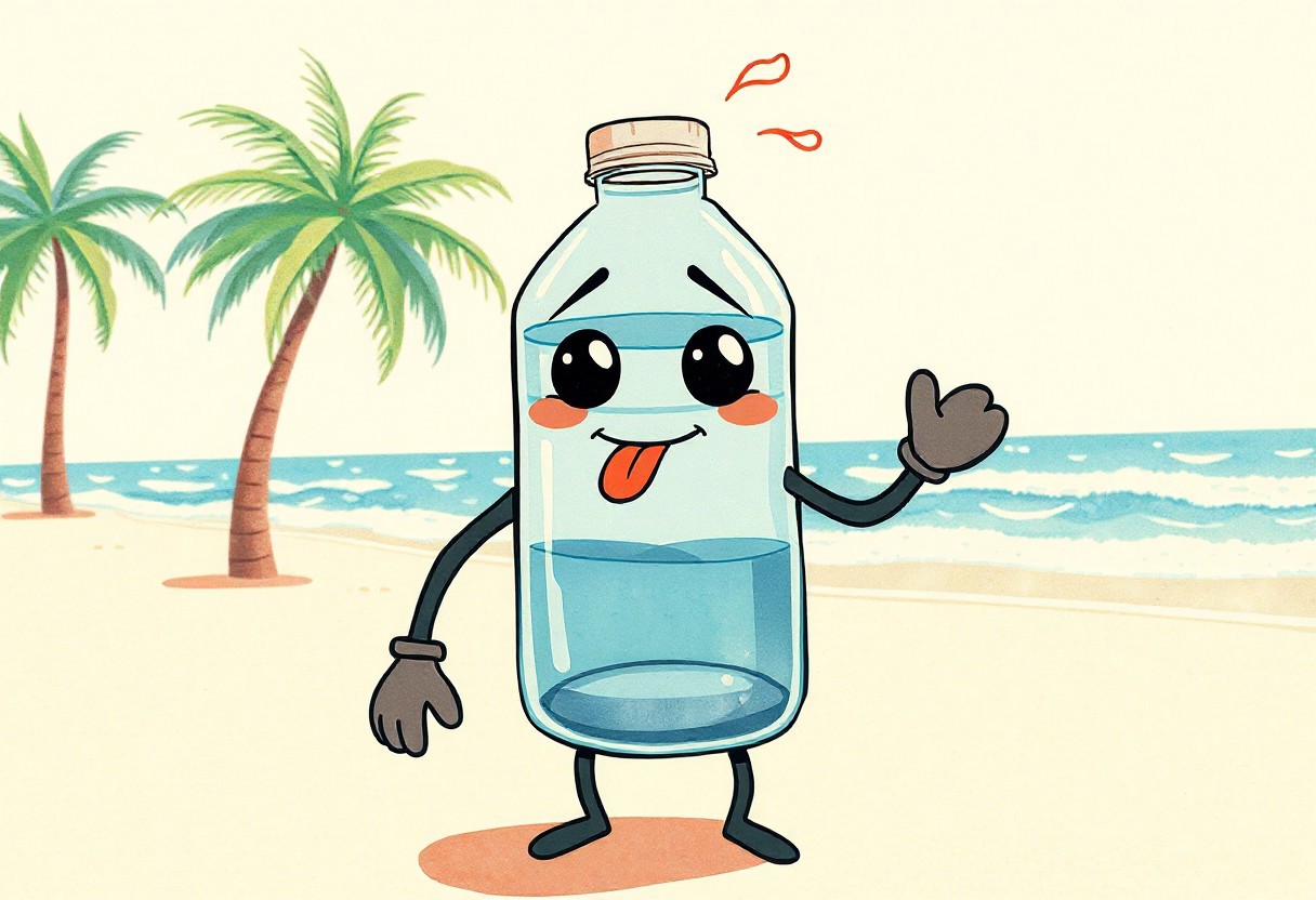 A 1930s cartoon-style water bottle character standing on a beach under the hot sun. The bottle is half-empty, with a transparent glass-like body showing sloshing water inside. It has large pie-cut eyes, a cute rubber hose mouth sticking its tongue out tiredly, and simple black rubber hose limbs — thin, bendy lines for arms and legs, ending in mitten-style hands and sock-like feet. It looks adorably exhausted, slightly slouched, with wavy heat lines around its head. Drops of sweat and steam rise from the cap. The beach is stylized like a 1930s cartoon set: simple palm trees, bouncy waves, and soft sand, all hand-drawn with watercolor texture. The whole scene has vintage film grain, flickering reel effect, and a warm, sepia-toned pastel palette. Very cute and old-school charming.