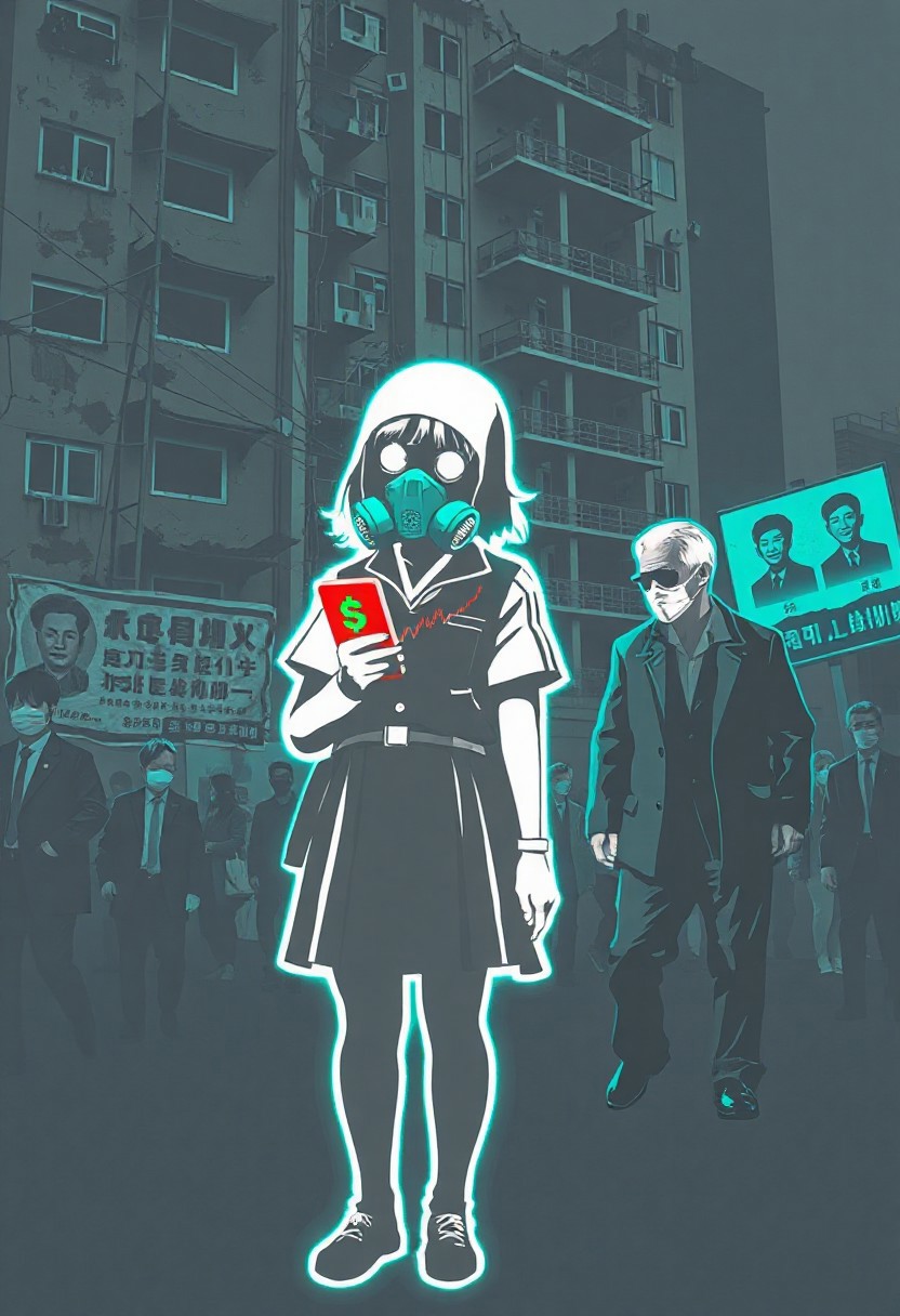 JNANX,luminous white silhouette,cyan glow,emerald highlights,flickering outline,dreamlike movement, A Banksy-style stencil graffiti artwork. A Korean high school girl in uniform and a gas mask stands in front of a crumbling apartment complex with shattered windows and scaffolding. She holds a smartphone glowing red and green, showing a rising cryptocurrency chart. Beside her, a homeless elderly man extends his hand for help, but she ignores him. In the background, people wearing suits and masks walk past giant propaganda posters and security cameras. The whole scene is grayscale, with only the phone screen in vivid color. Urban decay, inequality, generational divide — bold, satirical, politically critical.