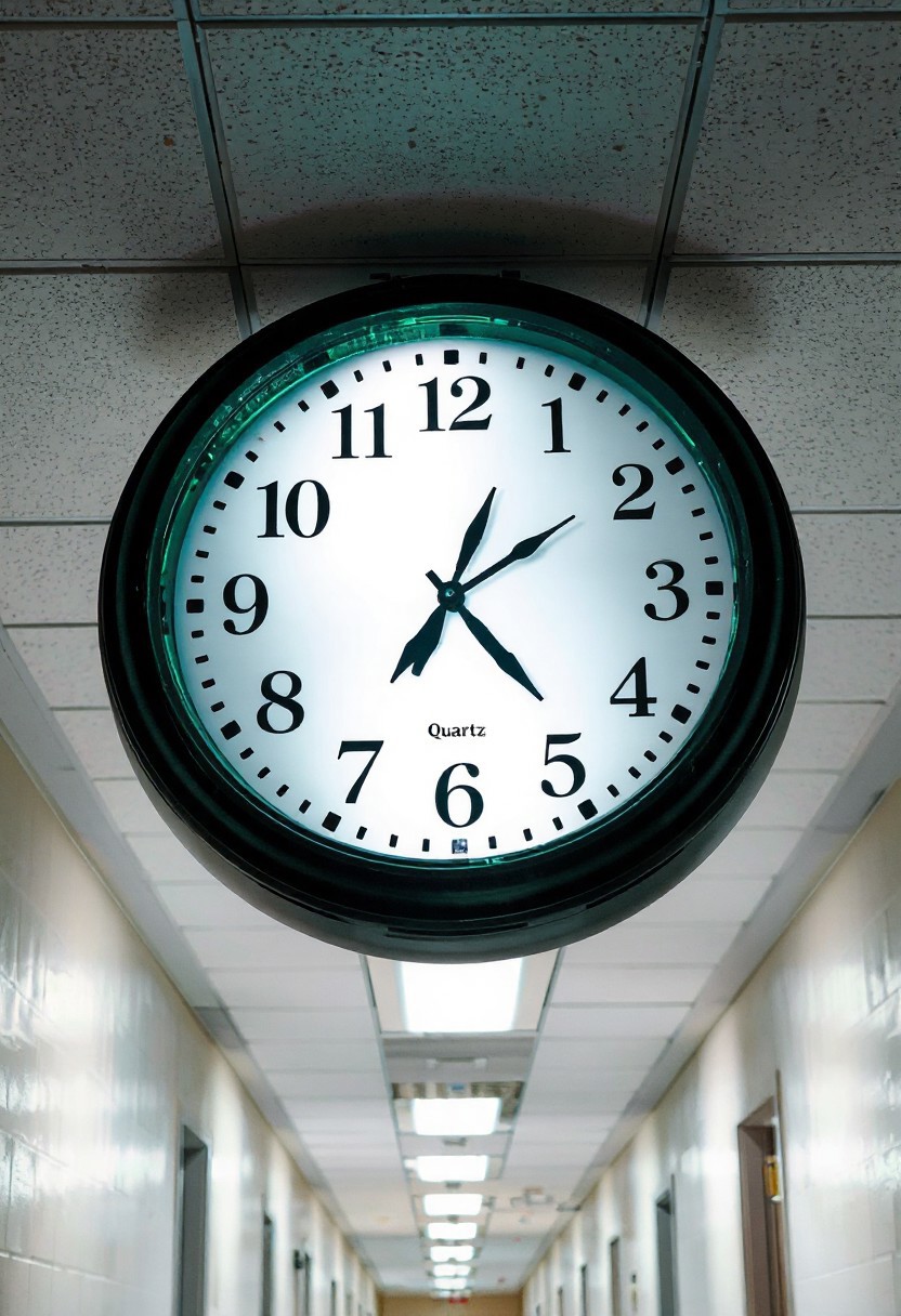 JNANX,luminous white silhouette,cyan glow,emerald highlights,flickering outline,dreamlike movement, A detailed mixed-media collage. This image captures a large, round, black-framed clock mounted on a white wall in what appears to be a school or office hallway. The clock face itself is white with clear black numbers from 1 to 12. Interestingly, the hour and minute hands are completely missing, indicating the clock is non-functional or broken. The "Quartz" label is visible towards the bottom of the clock face. The perspective is slightly upward, showing a typical drop-ceiling with square panels and fluorescent lighting fixtures. The lighting is bright, illuminating the clean, unadorned wall and ceiling. The overall impression is one of a forgotten or neglected piece of equipment in an otherwise ordinary, utilitarian institutional setting.