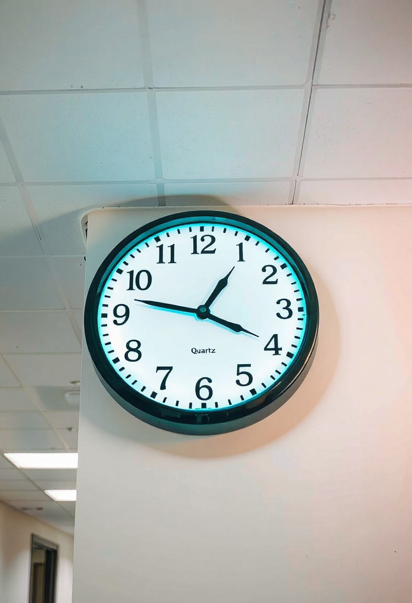 JNANX,luminous white silhouette,cyan glow,emerald highlights,flickering outline,dreamlike movement, A detailed mixed-media collage. This image captures a large, round, black-framed clock mounted on a white wall in what appears to be a school or office hallway. The clock face itself is white with clear black numbers from 1 to 12. Interestingly, the hour and minute hands are completely missing, indicating the clock is non-functional or broken. The "Quartz" label is visible towards the bottom of the clock face. The perspective is slightly upward, showing a typical drop-ceiling with square panels and fluorescent lighting fixtures. The lighting is bright, illuminating the clean, unadorned wall and ceiling. The overall impression is one of a forgotten or neglected piece of equipment in an otherwise ordinary, utilitarian institutional setting.