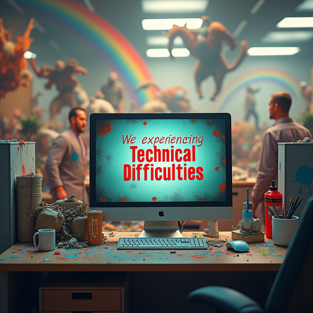 an office, a computer monitor that says "We're experiencing technical difficulties", chaos in the background, mayhem, insanity, discord, rainbows, paint, cubicles, stuntmen, wild animals, debris, unicorn
