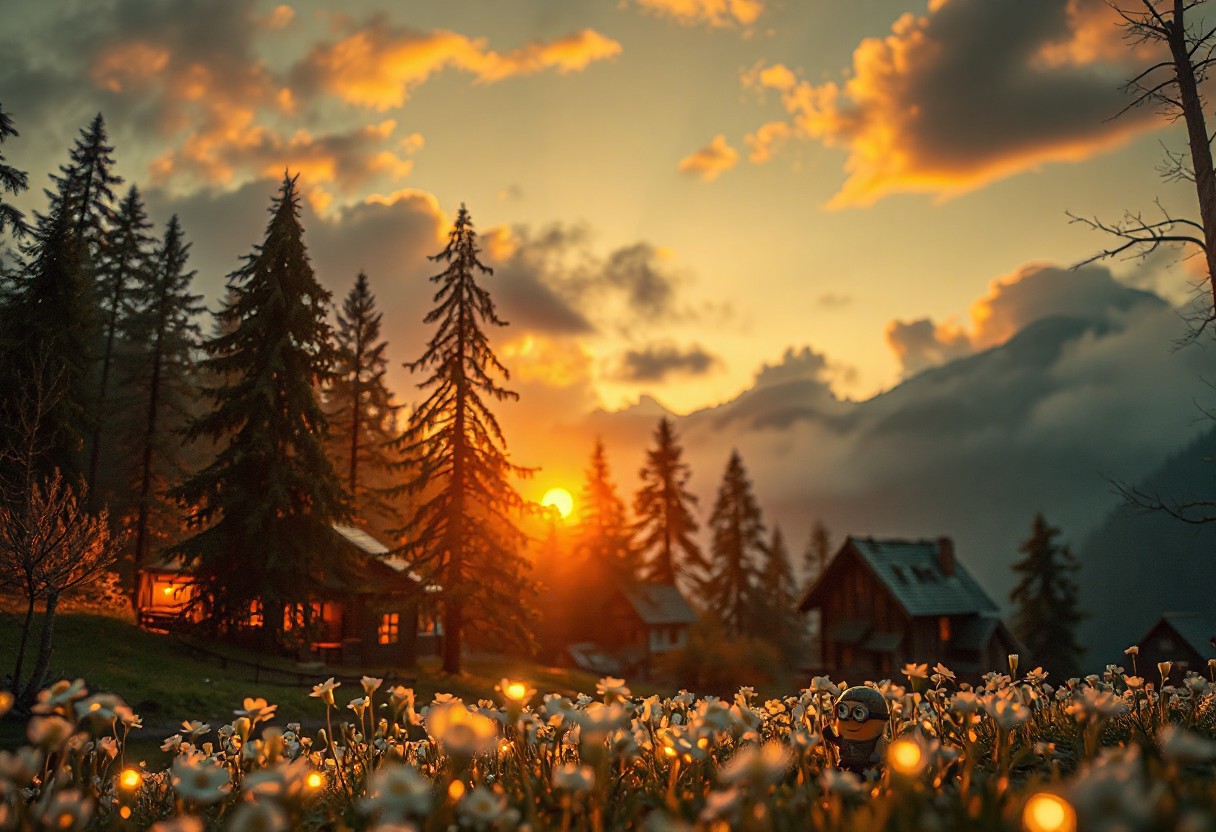 a warm elfen village, dim sunset, soft fog, fine detailed clouds here and there, tall trees, a tiny toy minion between white glowing flowers, soft bloom effects, wooden buildings, on a mountain side, mountains in background, dramatic lighting, Shot with a full-frame DSLR, 85mm lens and shallow depth of field, slight post-processing contrast boost and warm tone grading.