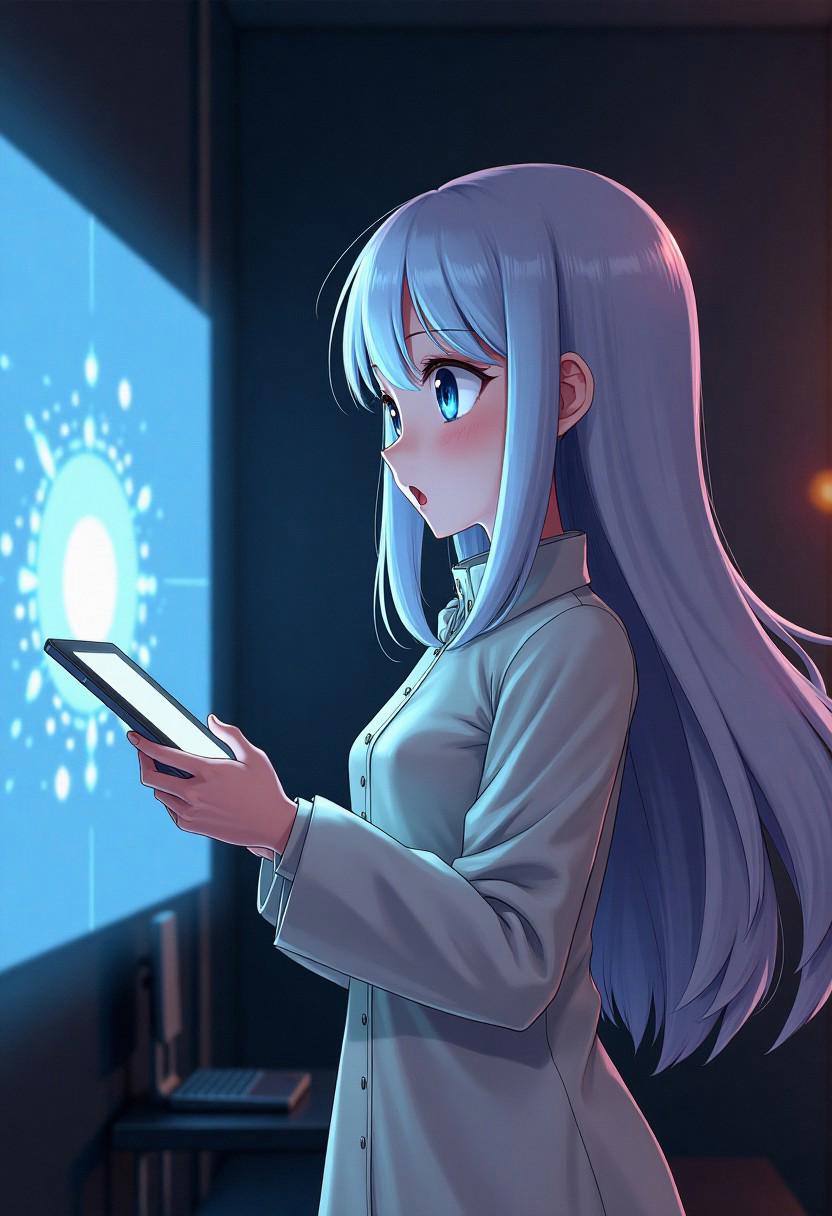 Create a surprised, strange, beautiful, and impressive futuristic anime that knocks on the pov screen and holds up a tablet saying "are you behind the screen"