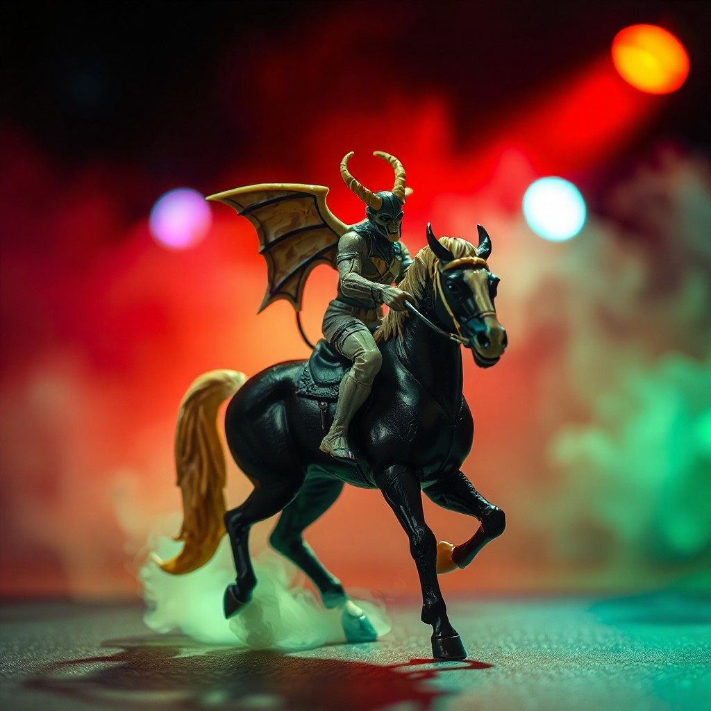 show me a wild version of a miniature toy. no lovey dovey but hard banging stuff. devil on a horse, red glowing fog in the background, 3 spotlights, red, blue and green, made out of, ebony, ivory, scrimshaw, bone carving, and dont forget the hyper details and ultra detail.