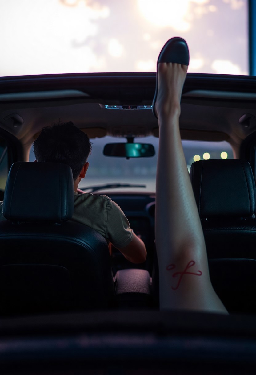 view of front of car at drive-in movie, screen lighting through the windshield dimly the front seat, where a 18yo couple have their heads leaning together, his arm around her shoulders, and lighting the back seat where a woman's widespread bare legs are sticking up in the air, shoe hanging from one foot. pov: movie screen facing car. , very detailed, detailed eyes, high detailed texture, realistic, photorealistic, perfect eyes, real life realistic, detailed background,