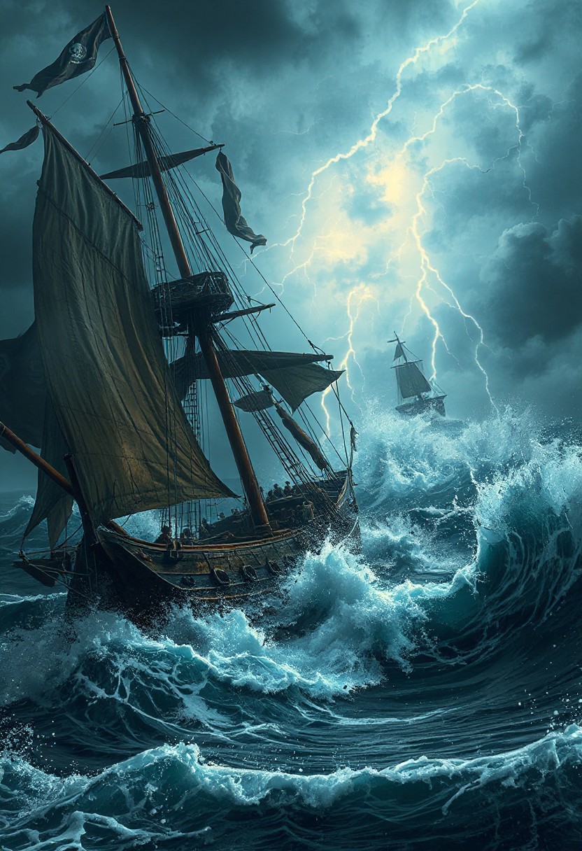 A pirate ship battles towering storm waves, tattered sails whipping violently as lightning illuminates panicked crew members scrambling on deck, the camera tilting dramatically with each wave's impact against the dark churning sea and swirling thunderclouds.