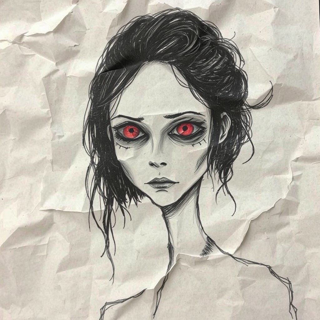Crumpled paper aesthetics, hand drawing, creepy, 1woman, red eyes, neutral expression, looking at viewer, dark circles under eyes, Scribble, scribbled, drawing, old paper, drawned, not real