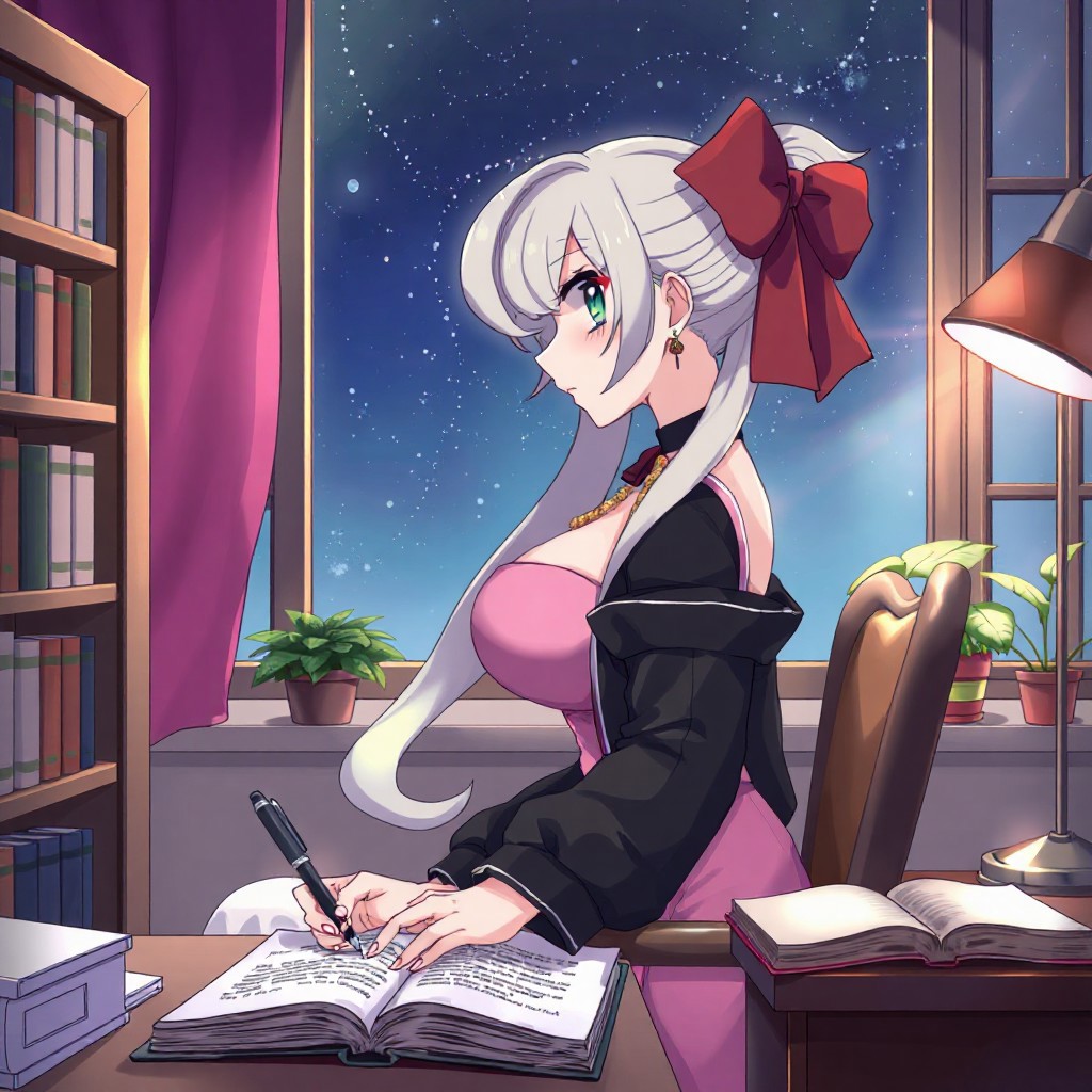 masterpiece, best quality, (huge breasts:5.5), (curvy), BREAK, zzMarnie, aqua eyes, black choker, red ribbon, pink dress, jewelry, black jacket, open clothes, long sleeves, <lora:MarniePokemonIllustrious:1.0>,zzLofi, sitting, side view, desk, chair, book, bookshelf, head rest, holding, holding pen, lamp, night, open book, pen, plant, potted plant, sky, star (sky), starry sky, window, windowsill, writing, , <lora:LofiGirl_Style_IXL:1.0>