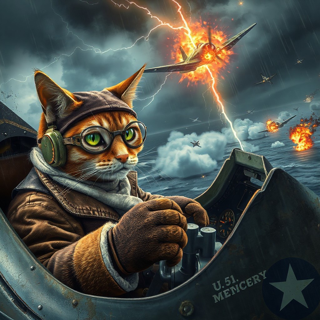 A hyper-detailed cockpit view of an anthropomorphic tabby cat piloting a P-51 Mustang in a fierce WWII aerial battle above a stormy ocean. The cat focuses intensely, gripping the controls, as enemy planes trail smoke and tracers streak past. Lightning flashes illuminate the chaotic sky, casting dramatic shadows across the cockpit. Cat Pilot: The orange tabby wears a brown leather flight jacket with a shearling collar, white silk scarf knotted at the neck, and a snug leather cap with ear holes, adorned with a faded squadron patch—a claw clutching a lightning bolt. Aviator goggles reflect the glowing dials, their lenses scratched from prior missions. A small oxygen mask fits its muzzle, and a headset with a tiny microphone rests over its ears. Its gloved paws—one on the throttle, one on the stick—show dexterity, with claws slightly extended in tension. Whiskers twitch, and its green eyes narrow with determination. Cockpit and Plane: The P-51 cockpit has worn metal, a scratched canopy with faint bullet marks, and glowing amber gauges. The stick is paw-friendly, wrapped in worn leather. Wings bear U.S. Army Air Forces insignia: a white star in a blue circle, faded from battle. Outside, smoke trails and bullet casings litter the sky, with a spiraling enemy plane engulfed in flames. Lightning highlights the cat’s fur texture and the gleam of its goggles. Rain streaks the canopy, and the plane shakes mid-maneuver. Colors are brown, green, silver, with fiery orange explosions.