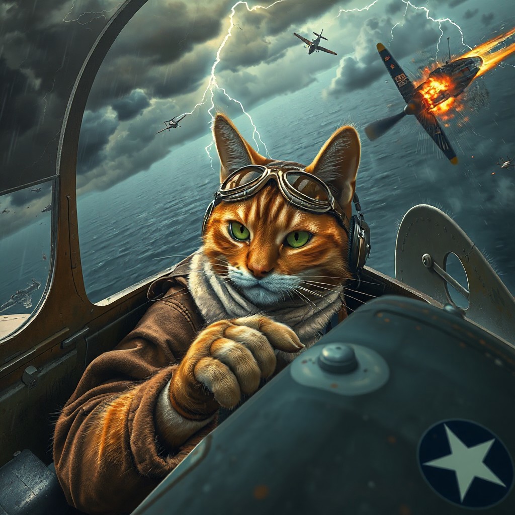 A hyper-detailed cockpit view of an anthropomorphic tabby cat piloting a P-51 Mustang in a fierce WWII aerial battle above a stormy ocean. The cat focuses intensely, gripping the controls, as enemy planes trail smoke and tracers streak past. Lightning flashes illuminate the chaotic sky, casting dramatic shadows across the cockpit. Cat Pilot: The orange tabby wears a brown leather flight jacket with a shearling collar, white silk scarf knotted at the neck, and a snug leather cap with ear holes, adorned with a faded squadron patch—a claw clutching a lightning bolt. Aviator goggles reflect the glowing dials, their lenses scratched from prior missions. A small oxygen mask fits its muzzle, and a headset with a tiny microphone rests over its ears. Its gloved paws—one on the throttle, one on the stick—show dexterity, with claws slightly extended in tension. Whiskers twitch, and its green eyes narrow with determination. Cockpit and Plane: The P-51 cockpit has worn metal, a scratched canopy with faint bullet marks, and glowing amber gauges. The stick is paw-friendly, wrapped in worn leather. Wings bear U.S. Army Air Forces insignia: a white star in a blue circle, faded from battle. Outside, smoke trails and bullet casings litter the sky, with a spiraling enemy plane engulfed in flames. Lightning highlights the cat’s fur texture and the gleam of its goggles. Rain streaks the canopy, and the plane shakes mid-maneuver. Colors are brown, green, silver, with fiery orange explosions.