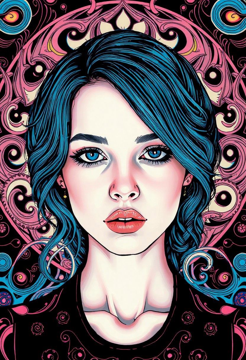 high quality design aesthetics, synth pop, detailed, pop album cover, beautiful young white woman, intricate swirls, patterns