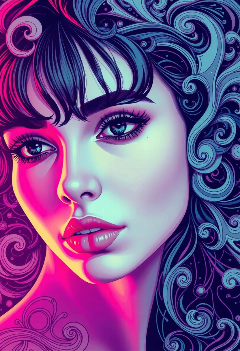 high quality design aesthetics, synth pop, detailed, pop album cover, beautiful young white woman, intricate swirls, patterns