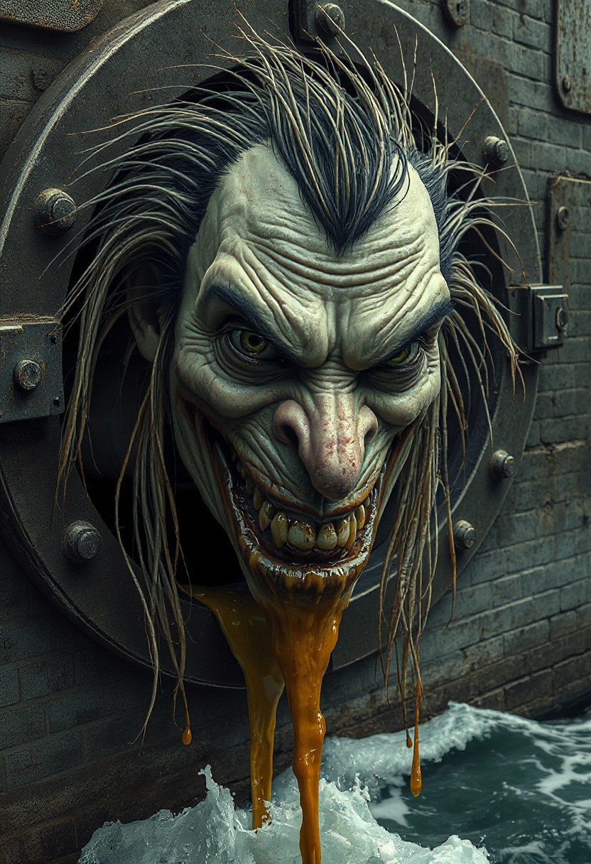 A nasty, vicious creature peers out of the darkness of an old factory manhole. The creature is gaunt and has long, stringy, thin hair that hangs wildly in its face. The nose is crooked and black hairs grow out of the nostrils. The skin is pale and pimply, the lips very dark and twisted into a malicious grin. The pipe protrudes from a coastal wall and disgusting, greasy liquid drips out into the surf of the sea. Photorealistic.