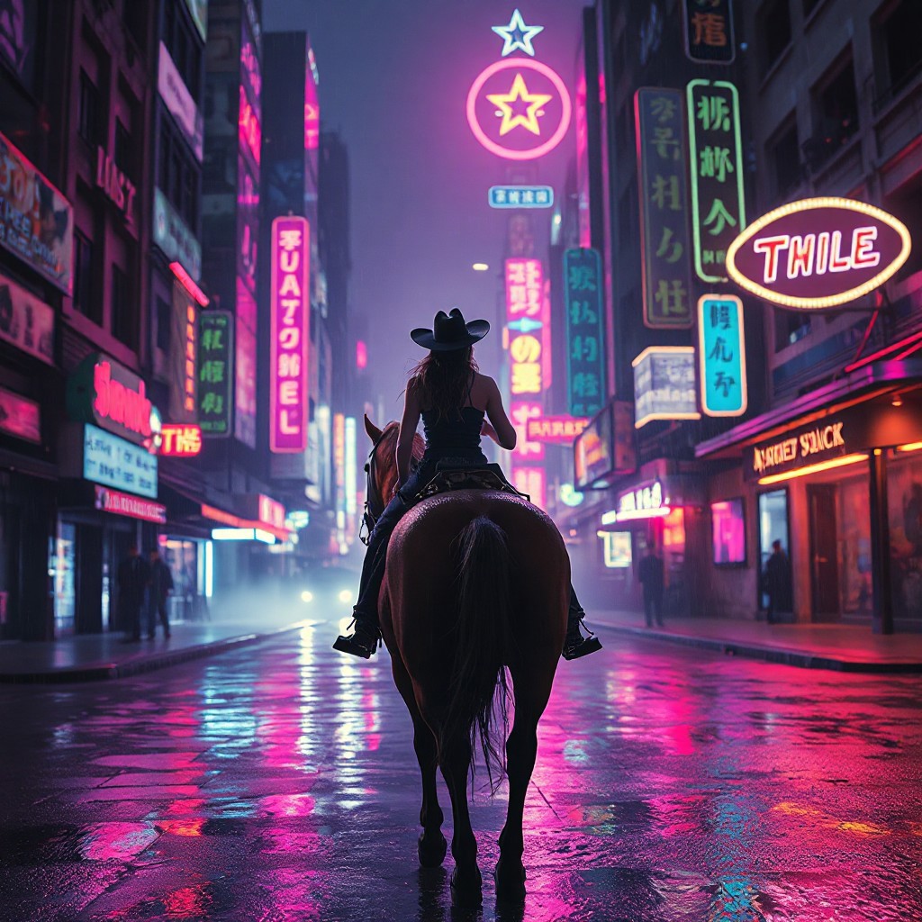 A lone cowgirl riding a horse into a futuristic neon-lit city at night, cyberpunk aesthetic, glowing signs and holograms, reflective wet streets, colorful neon lights in pink, blue, and purple, dramatic backlighting, cinematic composition, gritty sci-fi western fusion, ultra-detailed, 4K LoRA: cyberpunk streets, neon lighting, female cowboy, futuristic horse, urban night scene Weather : light rain, mist in the background Add camera : low angle shot, back view, film still