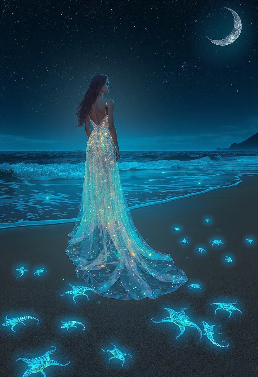 woman and a long dress made of fractals, a beach at night with bioluminescent stars and waves, a starry sky, glowing blue sea creatures on the sand, a crescent moon in the background, and an ocean flowing into the distance, the scene is peaceful yet mysterious, with the glow of fireflies adding to its ethereal beauty, 3d illustration, glitter, glow, ruby shine, opal, lumen, fractal, ultradetallization, 128k, HDR