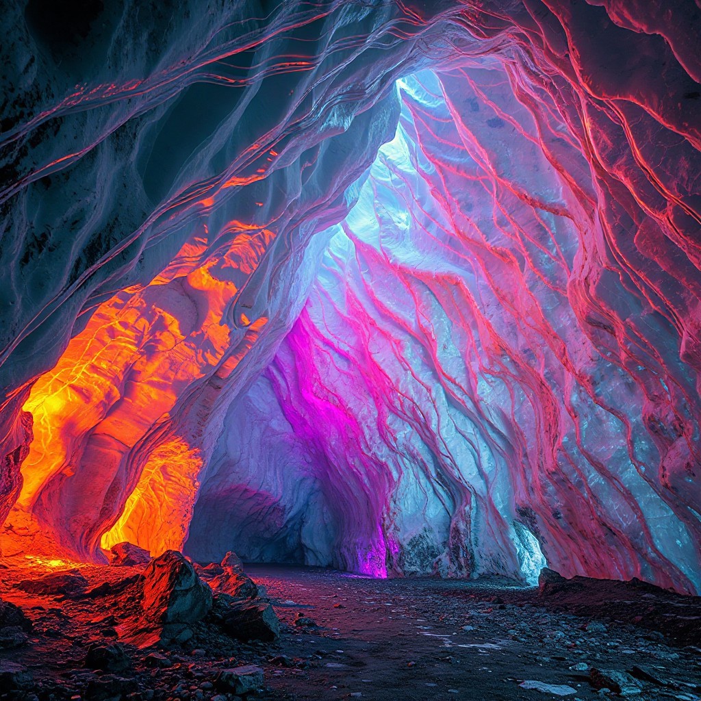8k, source_photo, source_real, traditional media, real life photo, huge natural ice cave, lit from above, vivid ice patterns, bright colours in the ice, glowing runes on the wall, exposed rock formations cover the ground and walls, medieval, dungeons and dragons