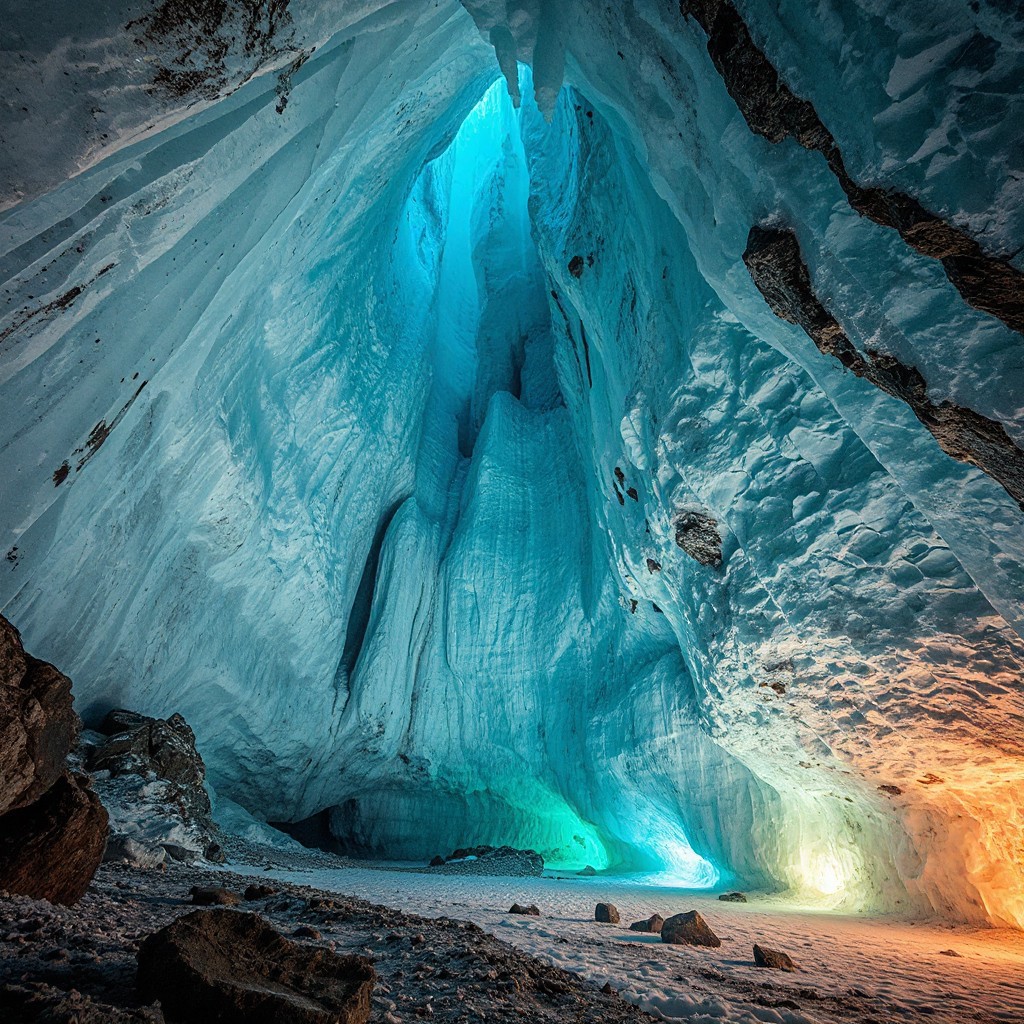 8k, source_photo, source_real, traditional media, real life photo, huge natural ice cave, lit from above, vivid ice patterns, bright colours in the ice, glowing runes on the wall, exposed rock formations cover the ground and walls, medieval, dungeons and dragons