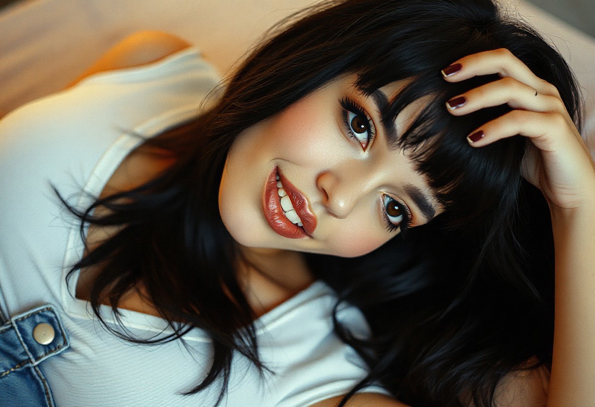 CIVITAI GENERATOR TXT2IMG score_9, score_8_up, realistic, raw lighting, detailed, (warm colors, bokeh), high contrast, best quality, masterpiece, fashion magazine style, great lighting, perfect shading, professional shading, Photo Focus, DOF, Aperture, canon 4d, film grain, BREAK polaroid film photography, fluxenh4nce, real_beauty, BREAK 21 yo woman, cute face, luscious lips, parted lips, teeth, long messy black hair, (bangs:1.2), hazel eyes, tight white v-neck shirt, cleavage, jeans shorts, (skin tags, skin pore, skin textures, skin details, pale skin:1.1),(light freckles:0.8), BREAK bedroom, from side, intense attitude, ass, lying side, sexy, seductive, inviting, looking down at own breasts, nervous, her own hand touching her hair