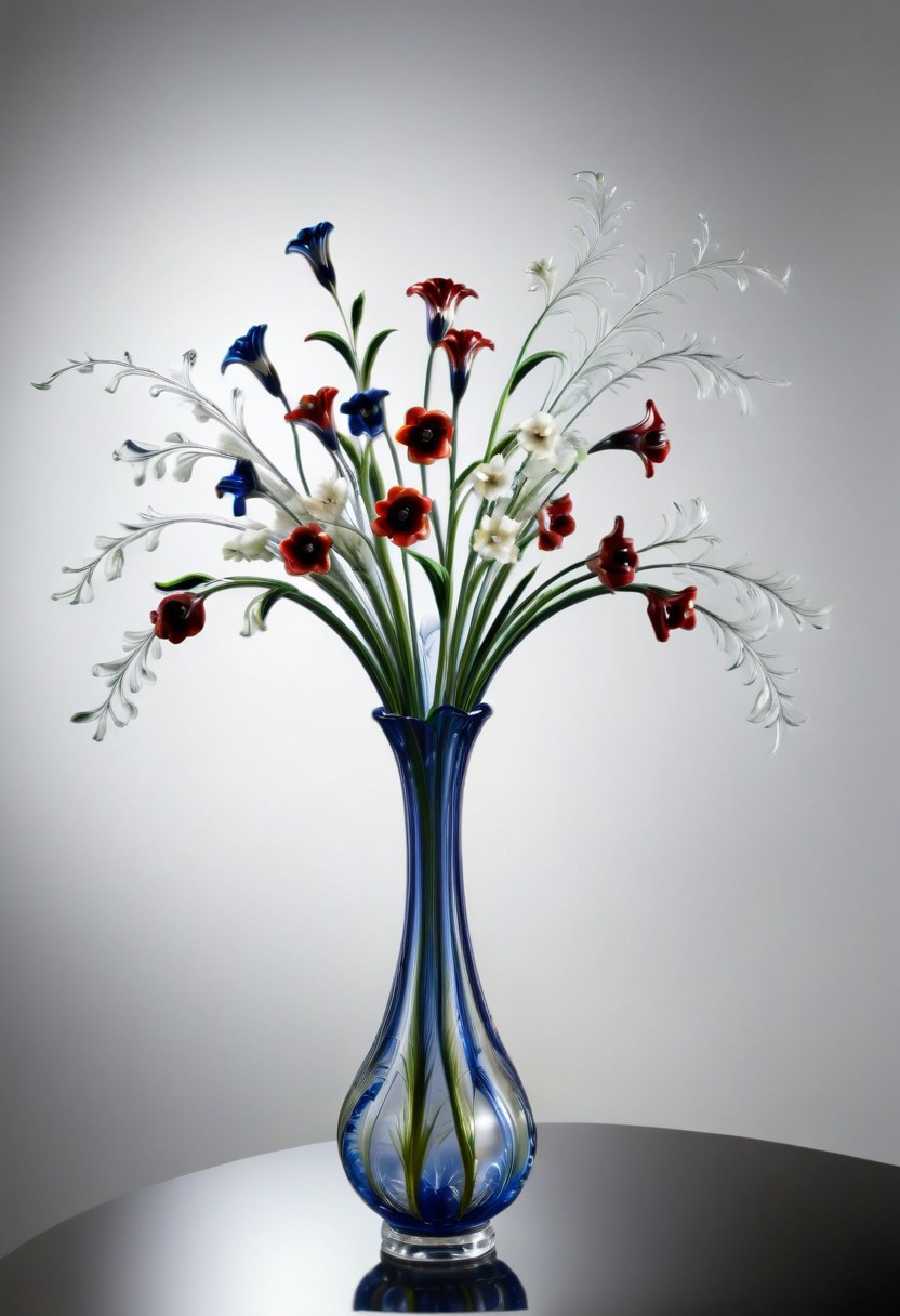 murano_glass_style, livingroom, salon table, (vase with flowers murano_glass_style:2). (indoors:1.6), (large room:1.2)