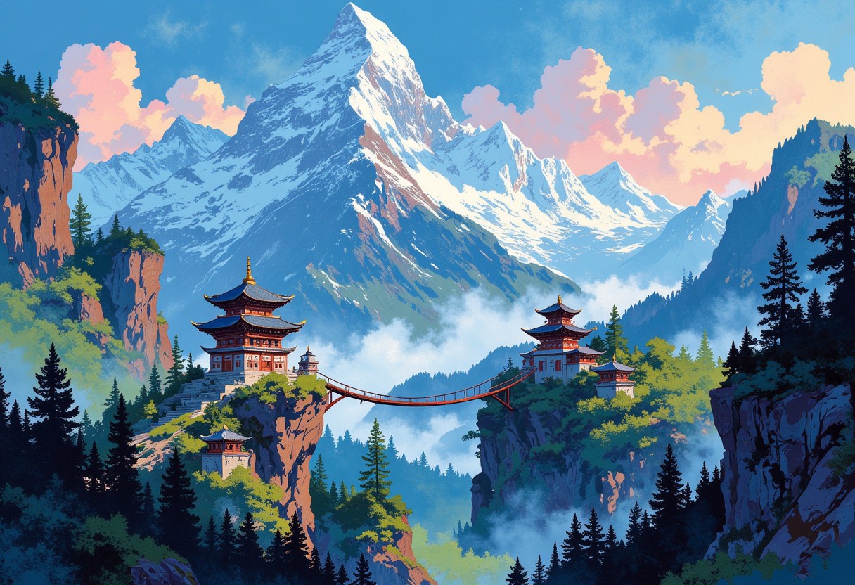 A majestic landscape depicting high snow-capped mountains. In the valleys between the mountains, the forest is covered with fog. Inaccessible ancient oriental temples are located on the slopes of the mountains. The temples are connected by wooden suspension bridges. The temples are covered with colorful exotic paintings. Blue sky with hints of pink and orange on delicate clouds. The forest in the valleys is dark and mysterious. A bizarre surreal landscape in the style of modern impressionism. A magical place. i11ustmin Illustration