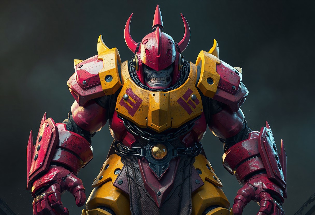 Hyperdetailed pink & yellow Garbage Ogre robot, red helmet, black chains, World Legacy in Shadow backdrop. Confident stance. Matte painting, splash ink illustration, octane render, Unreal Engine 5, Raphael style, Houdini style, dynamic action pose, grammer effect, captivating lighting, isometric, trending on Artstation, CGSociety, 16K, golden ratio.