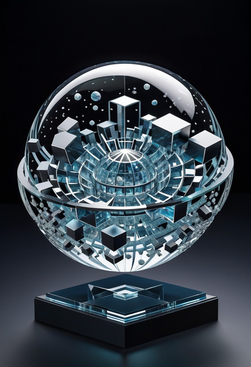 A sphere unfolds layer by layer into crystalline prisms, floating in zero gravity, each segment rotating mathematically like an Escher-inspired celestial machine.