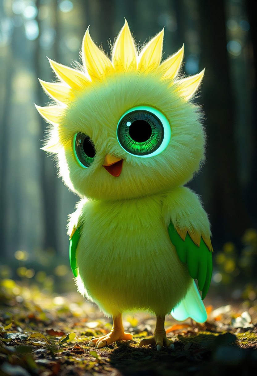 JNANX,luminous white silhouette,cyan glow,emerald highlights,flickering outline,dreamlike movement, A Banksy-style. a cute adorable anthropomorphic eyeball monster dress like a parrot, round body, plump kiwi shape, fluffy fur, forest, sunlight, soft natural light. cute, big-eye, adorable, brightly colored, cheerful, anime influence, naughty face, laughing, happy, playful, cheerful, bright, vibrant, light-hearted, characters, digital, fantasy, illustration, manga-anime, portraits, whimsy, 3d-rendering, concept-art, digital, dreaminess, eeriness, photorealism, other-worldliness, realism, science-fiction, surreal, colorful, aidmafluxpro1.1