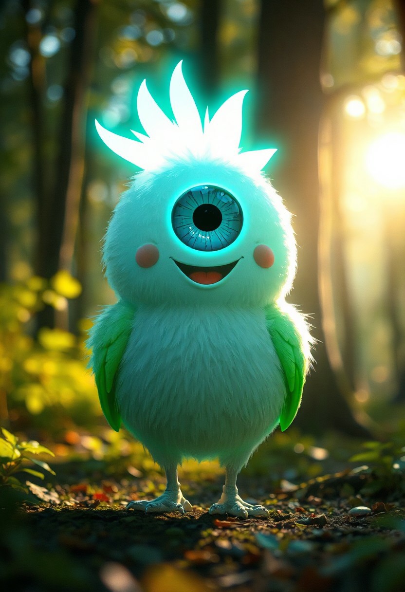 JNANX,luminous white silhouette,cyan glow,emerald highlights,flickering outline,dreamlike movement, A Banksy-style. a cute adorable anthropomorphic eyeball monster dress like a parrot, round body, plump kiwi shape, fluffy fur, forest, sunlight, soft natural light. cute, big-eye, adorable, brightly colored, cheerful, anime influence, naughty face, laughing, happy, playful, cheerful, bright, vibrant, light-hearted, characters, digital, fantasy, illustration, manga-anime, portraits, whimsy, 3d-rendering, concept-art, digital, dreaminess, eeriness, photorealism, other-worldliness, realism, science-fiction, surreal, colorful, aidmafluxpro1.1