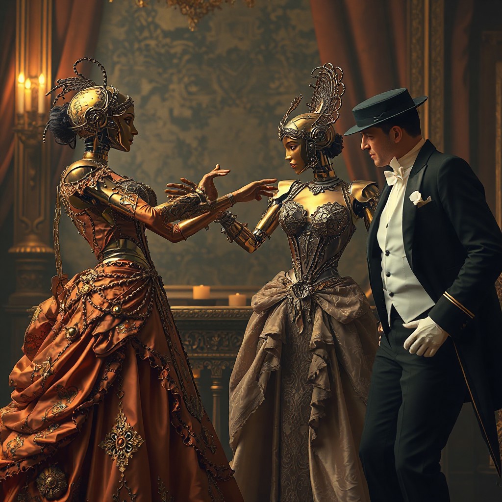 Full height view. An Edwardian automata brass Gibson Girl sexbot wearing an elaborate Edwardian evening gown is fighting with the wife of an Edwardian gentleman, photorealistic