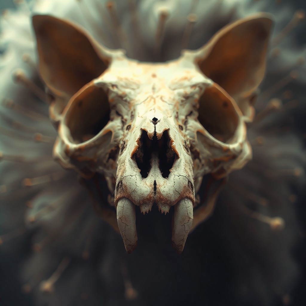 (cat skull:1.2). vacuum black holes in the eye sockets suck in threads of matter surrounding the skull. fish eye effect, motion zoom blur effect, panpsychism