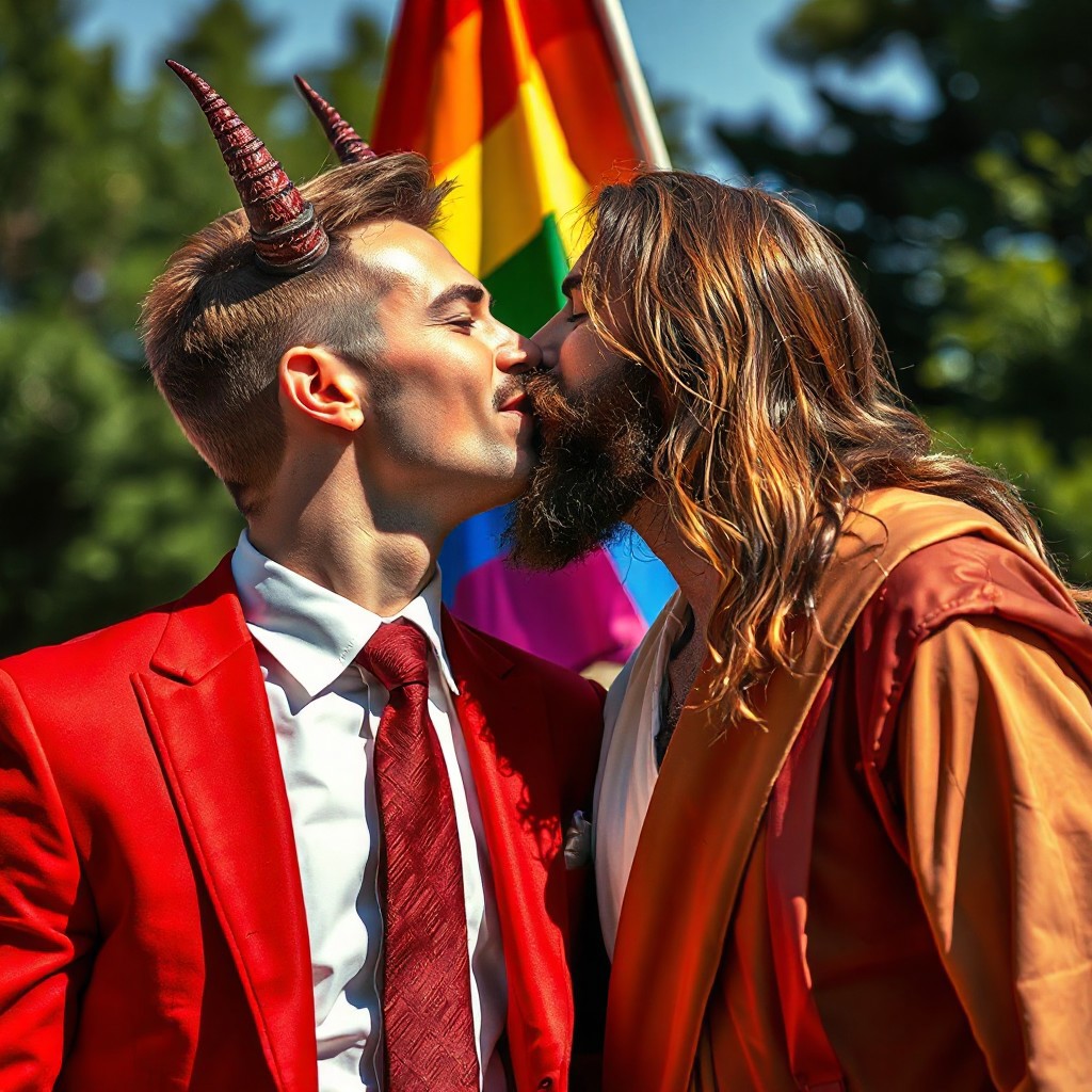 2 happy men kissing each other, sunny, outdoors, there is a rainbow colored flag just behind them, (two men kissing:1.1), realistic photo masterpiece, high quality, detailed, gay, BREAK, The man on the left is attractive and well dressed in an expensive red suit and tie, the man on the left has goat horns at his temples, the man on the left has nice hair, the man on the left has a mustache and goatee but no other facial hair, the man on the left is cosplaying as the devil, BREAK, the man on the right is the typical depiction of jesus christ, The man on the right has long brown hair and a full beard, the man on the right is wearing a white robe and brown sash, BREAK The two men are in love, happy, (gay pride, rainbow flag:1.2)