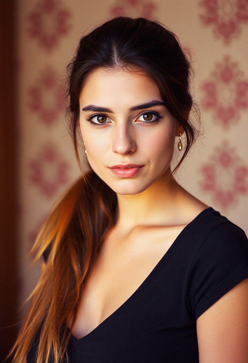 An armenian woman with brunette hair in a long ponytail with golden purple and orange tips, ,portrait shot from the front, 85mm, velvia. The photo should be extremely detailed, and in RAW photo format. 44d bust, boob focus, 1993, 90s home video, nostalgic 90s photo, taken with kodak disposable camera