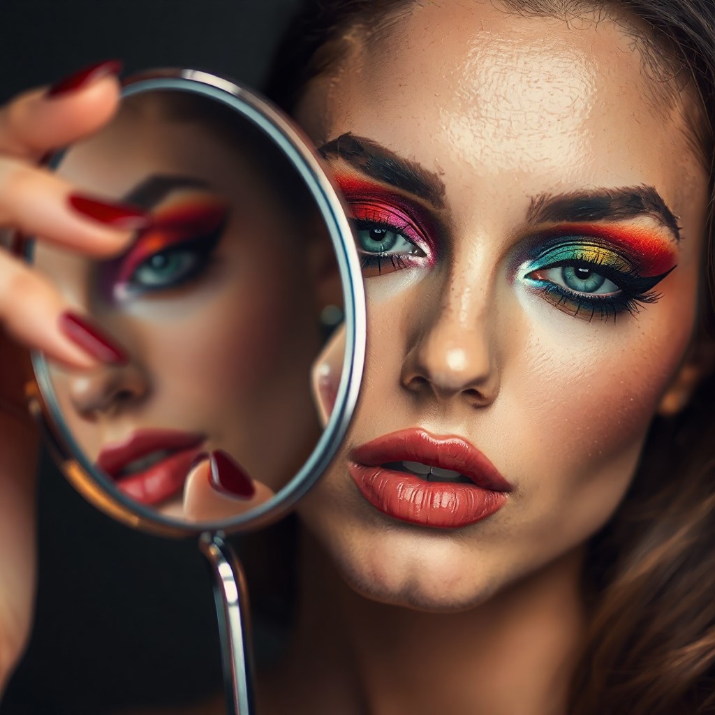 beautiful woman, makeup, looking at hand held mirror, eyeshade varied colors: red, purple, blue, green, orange, black. close up on face in mirror