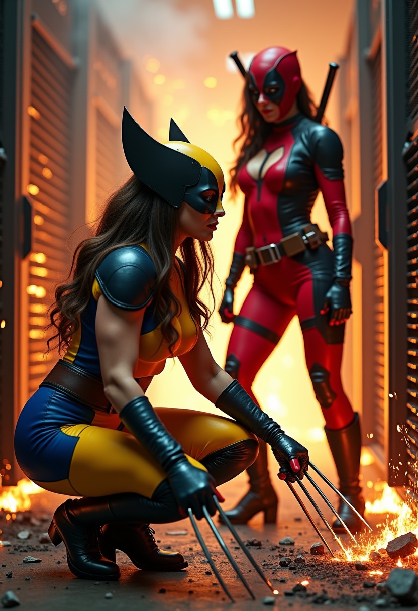 In this image, two naturally very busty supermodel women dressed in superhero costumes are engaged in a dynamic and intense scene inside a burning server room. The environment is chaotic, with large servers toppled over and engulfed in flames, sending sparks and smoke into the air. The remnants of the servers lie scattered around, their once-gleaming metal now charred and twisted from the heat and destruction. The woman on the left is clad in a bright yellow and blue suit, with metallic claws extended from her fists, reminiscent of a Wolverine-like character. Her long, dark brown hair cascades over her shoulders as she crouches low, her expression fierce and focused. She appears to be in the midst of tearing through one of the large servers, the sparks flying from the impact of her claws against the metal. The woman on the right, dressed in a red and black Deadpool-style suit, stands slightly behind her companion. She holds two katanas crossed behind her head in a defensive yet ready-to-strike stance, poised to fend off any threats that might emerge from the chaos. Her long blonde hair is styled in loose waves, framing a determined and intense expression as she surveys the burning room. The setting is a stark contrast of technology and destruction, with the flames casting flickering shadows and highlighting the vivid colors of their costumes.