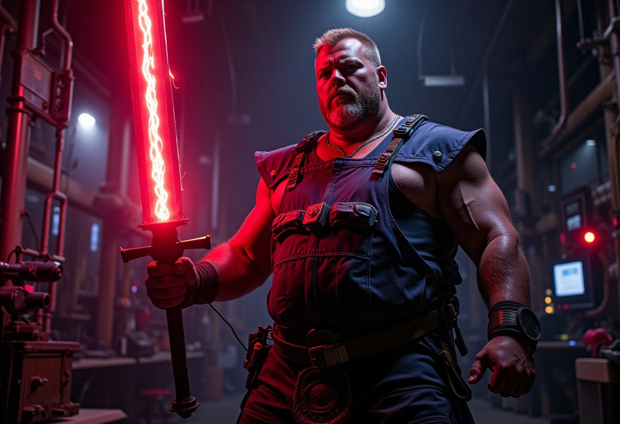 cyberpunk, extremel detailed raw nighttime night photograph, character in dark shadows neonlit rimlight, arthouse romance film scene, cinematic atmosphere dark gloomy atmosphere, hyperrealistic digital rennaissance oil painting, by gengoroh tagame and jiraiya and goh fujimoto, dark room at night, german bavarian fat manly hairy musclechub grandpa strongman, huge muscular steroid arms, tanned sweaty oiled skin, big hairy belly, very hairy body, detailed bodyhair, blonde brown short hair, in evil scifi hypermodern science lab full of advanced machinery, he is holding a large glowing red zweihander claymore sword that emits strong magic energy, dark purple and orange neonlights, he exudes a powerful dark aura, he is wearing a dark blue fullbody overall with suspenders and a toolbelt with many leather pockets, brown leather bracers, scottish kilt, heavy metal rock musci vibes, aggressive attack pose, ready for battle, electric lightning emitting from body and sword