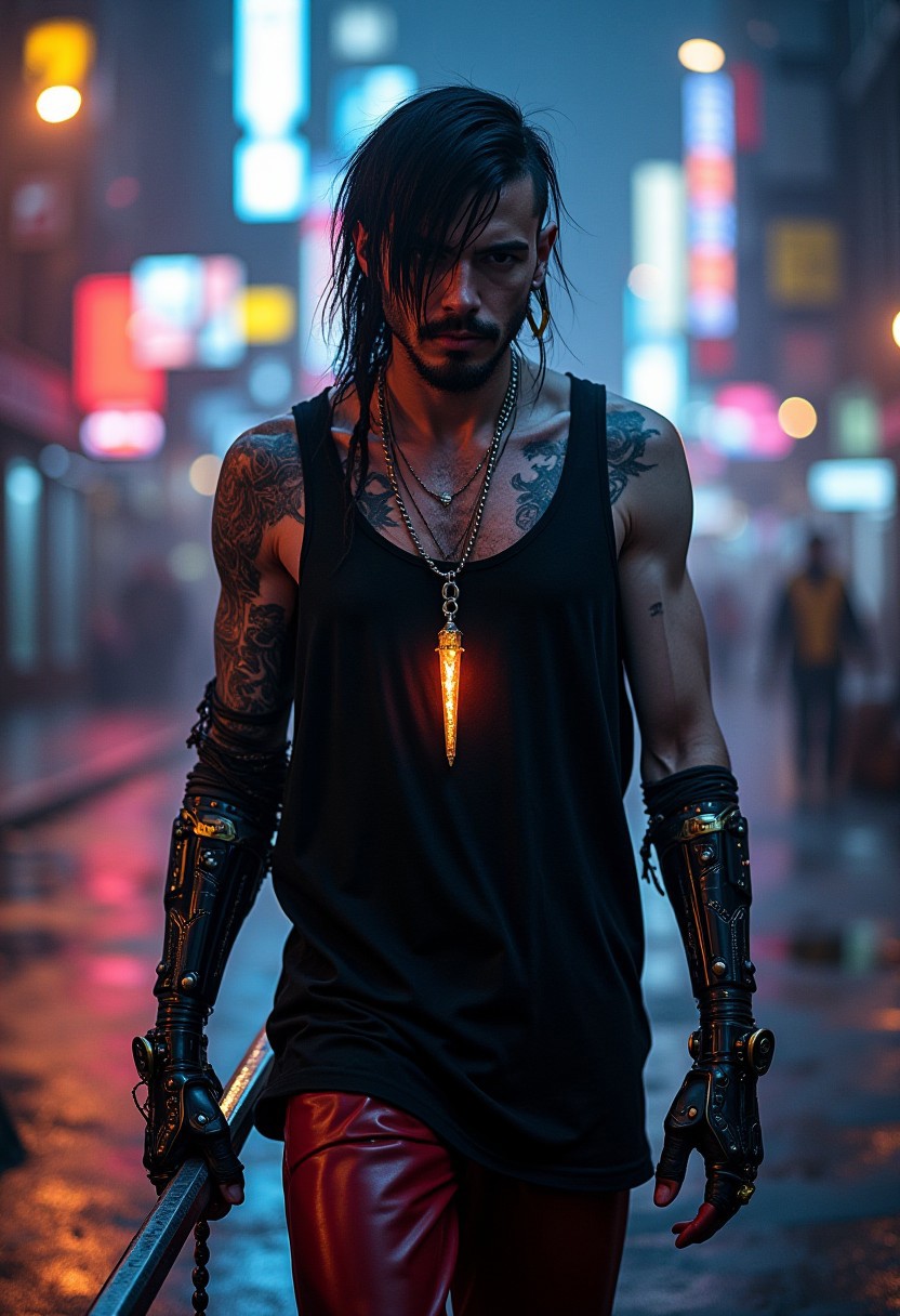 halfprofile frontal portrait from above,cyberpunk megastructure future scifi film, full hd raw detailed nighttime night photograph, cinematic atmosphere with hazey neonlit background, german polish thin tall 190cm man in his thirties, pale fair skin, goatee, long thin nose, long black emo haircut where hair covers his forehead, multiple golden ear piercings in upper ear, while walking towards viewer, dark red leather pants, long silver necklace with orange glowing crystal pendant, oversized loose black v-neck muscleshirt tanktop, black cybernetc arms with colorful analogue robot implants, he is holding a large black electrified zweihander claymore sword that emits strong magic energy, aggressive attack pose, ready for battle, electric lightning emitting from body and sword