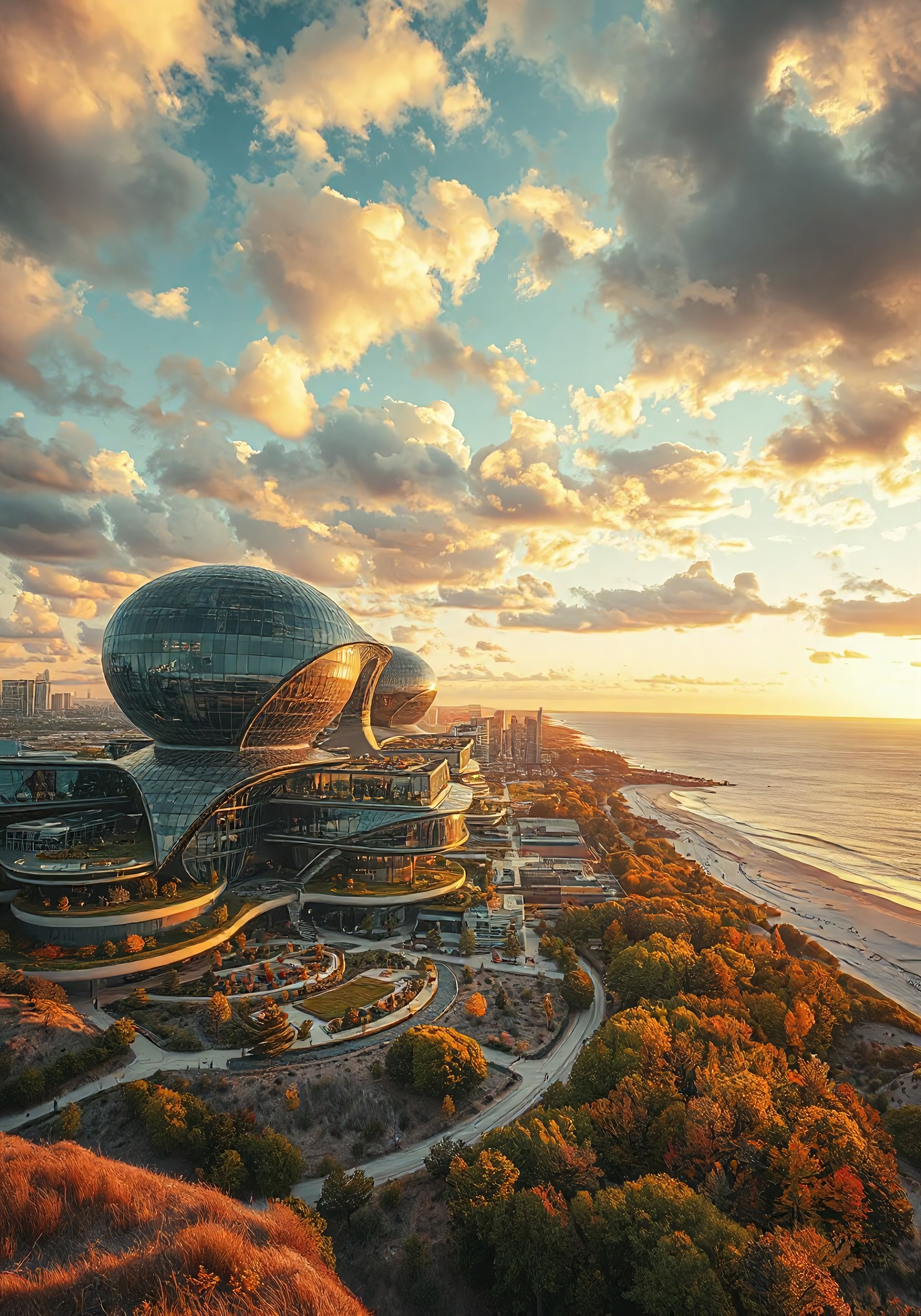 Tilt shift aireal photo, sprawling Futuristic Solarpunk city on shores of Lake Michigan, organic shaped glass megastructures with terraced gardens and green space, sunset sky with puffy clouds, surrounded by dunes and temperate forests sandy beaches, (fall colors, trees changing color in autumn)