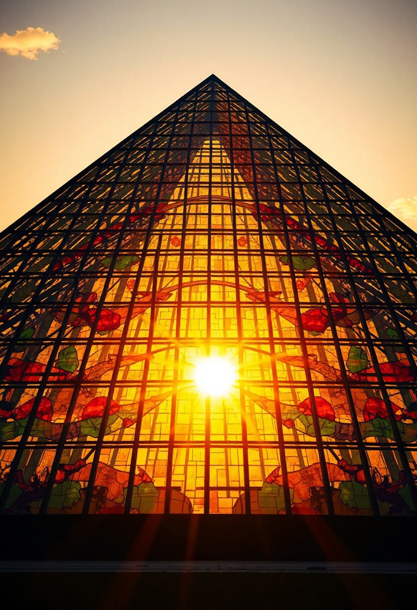 (Photorealistic photograph:1.5), looking at giant modern wide based pyramid entirely of multicolored stained glass, (sun shining through glass),sunset golden hour