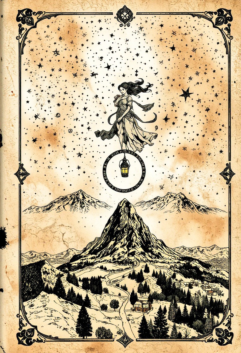 Necronomicon Sketch, constellations of stars fill the top third of the page, among which floats the stylized image of a woman in a magic circle, the body of the woman is a lantern, at the bottom of the page is a landscape including hills, a mountain, a forest and a town, with roads connecting all of them, in the center of the page is a figure in a robe surrounded by a magic circle <lora:Necronomicon-10:0.8>