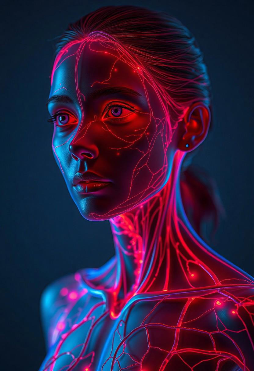 3d human vascular system) made entirely of glowing fluorescent red and blue light, circulatory system, female, RAW, high-resolution image, realism, realistic, real life, photorealistic, detailed, sharp details, (best quality:1.2), uhd, masterpiece, ultra-realistic, (best render:1.4), sharp detailed facial features, transparent body, arteries and veins,