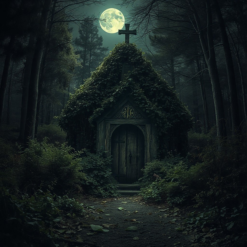 8k, source_photo, source_real, traditional media, real life photo, small abandoned chapel, covered in vines and overgrown with bushes, dark, moonlight, faint glowing mystical runes, forest clearing, dark and foreboding, dread and danger, medieval, dungeons and dragons, real photo