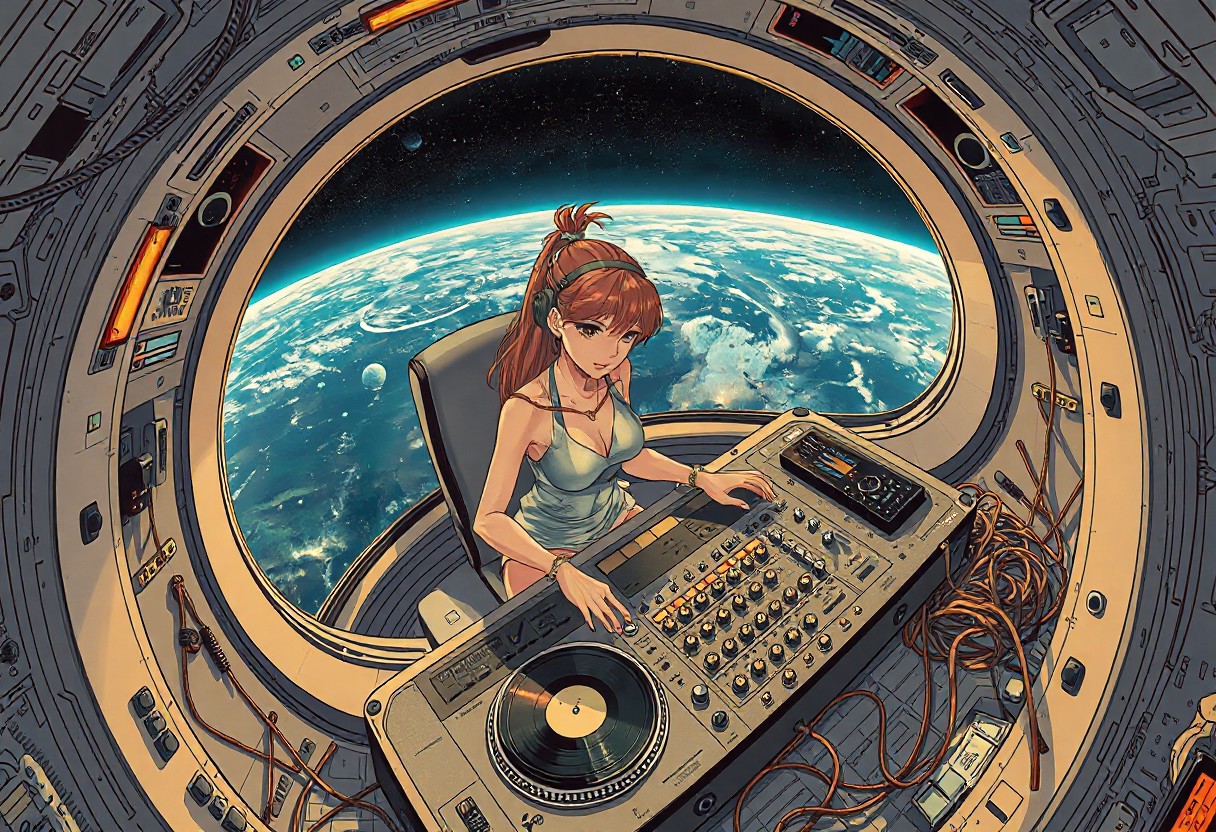 This image portrays an intricately detailed, retro-anime-styled illustration of a young woman DJ performing inside a futuristic spacecraft floating gently in the orbit of Earth. Depicted with exceptional detail and dynamic linework reminiscent of classic anime, the scene radiates a blend of retro charm and futuristic energy. The artist utilizes a pronounced wide-angle perspective, dramatically capturing the scene from above, creating a sense of vastness and depth that visually stretches into outer space. The DJ’s console, rendered meticulously, brims with vintage analog dials, knobs, vinyl turntables, and numerous cables intricately woven through the cockpit, showing meticulous attention to technical detail. She’s dressed stylishly—an eclectic mix of retro fashion and cyberpunk elements,